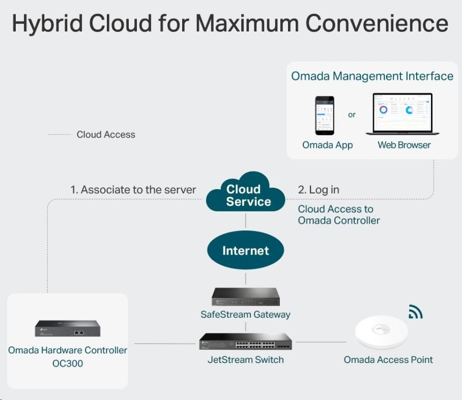 - Centralizovaná správa - až 500 prístupových bodov Omada, 100 JetStream switchov a 100 SafeStream smerovačov.