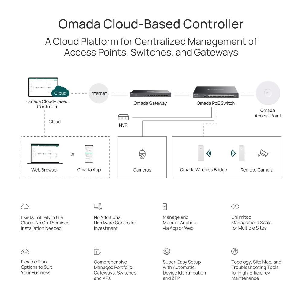 Cloudový kontrolér Omada, existujúci úplne v cloude pre platformu softvérovo definovaných sietí Omada (SDN), poskytuje 100% centralizovanú cloudovú správu prístupových bodov, switchov a brán – to všetko z jedného rozhrania. Nie je potrebné investovať do ďalšieho hardvéru alebo vykonávať inštaláciu na mieste u zákazníka. Použitie riešenia Omada typu Zero-Touch umožňuje vzdialené nasadenie a konfiguráciu sietí v viacerých lokalitách, takže nie je potrebné poslať technika, aby vykonal konfiguráciu na mieste. Cloud Omada zabezpečuje efektívne nasadenie pri nižších nákladoch.