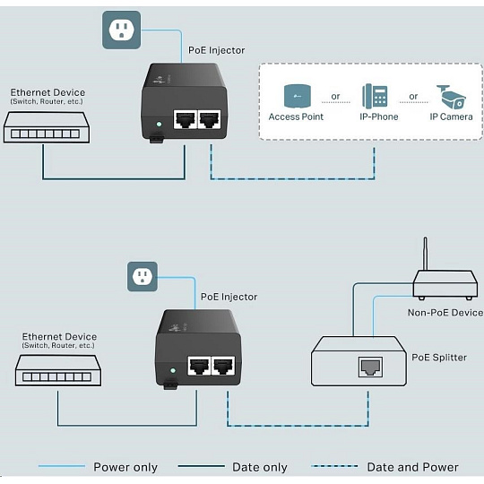 Injektor PoE+ POE160S plně vyhovuje standardu IEEE 802.3af/at a podporuje všechny adaptéry přijímače PD nebo PoE kompatibilní se standardem IEEE 802.3af/at PoE, např. TP-Link POE10R nebo jiné podobné produkty a rozšiřuje vaši síť tam, kde není elektrické vedení či zásuvka pro připojení zařízení, jako jsou přístupové body, IP kamery, IP telefony apod.
