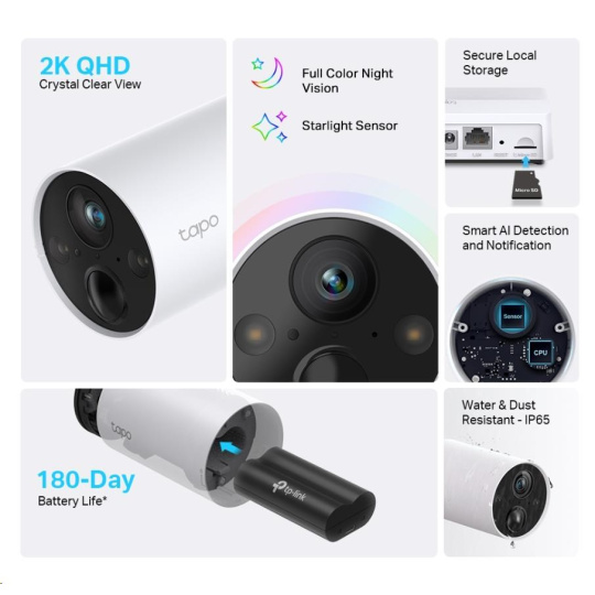 | Obsah balenia | Tapo C420 kamery (batéria súčasťou) Tapo H200 hub USB adaptér USB kábel adaptéra Napájací adaptér DC Montážne skrutky Montážne šablóny Držiaky kamery Rýchly štartovací sprievodca RJ45 ethernetový kábel |