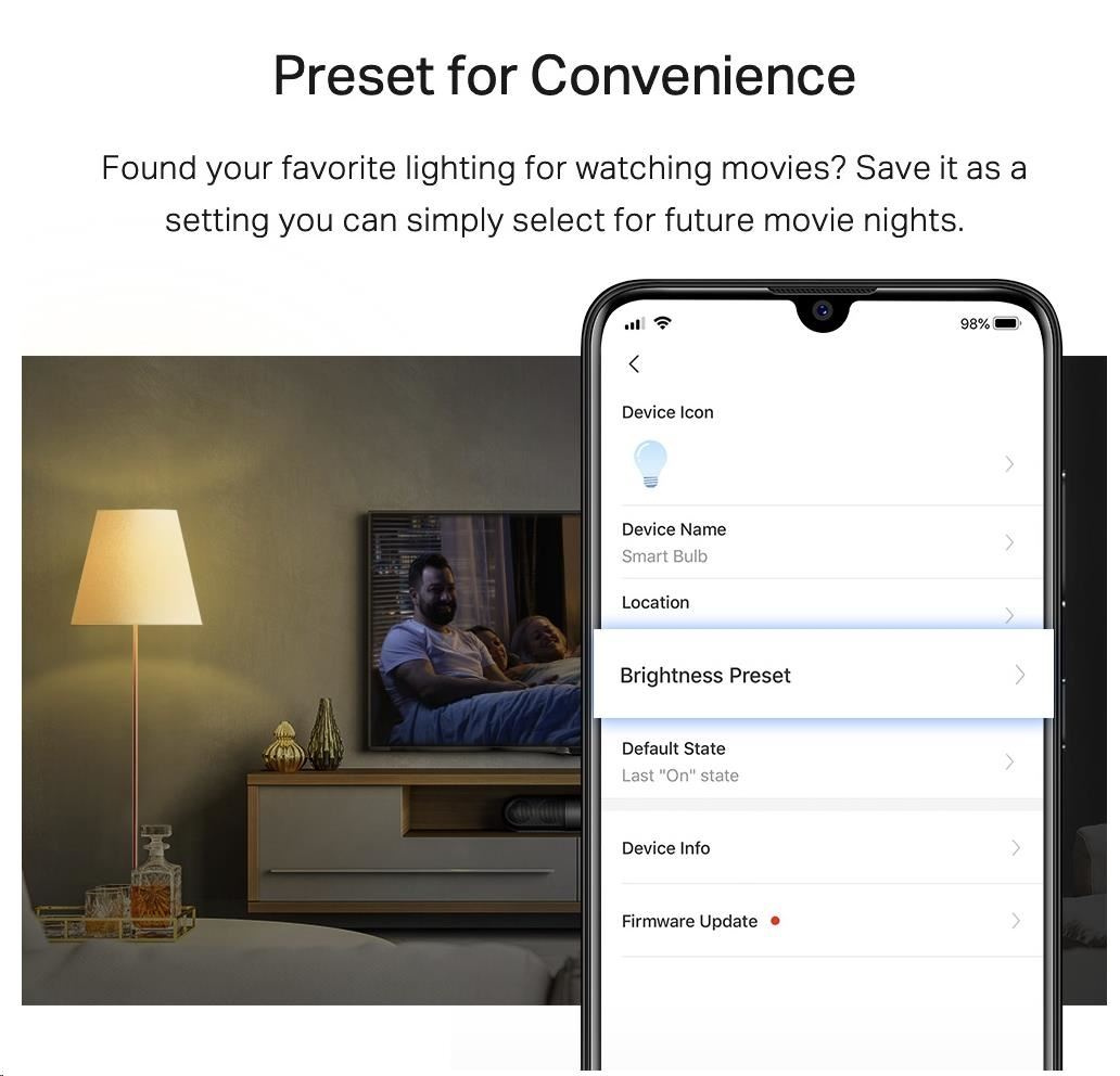 - Stmievateľná (nastavenie pre vaše pohodlie) – Našli ste svoje obľúbené osvetlenie na sledovanie filmov? Uložte ho ako nastavenie, ktoré si môžete ľahko vybrať pre budúce filmové večery.
