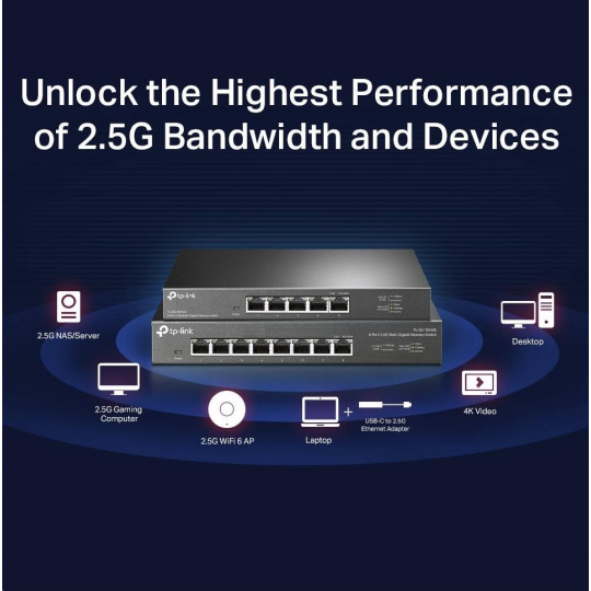 - Osem portov 2,5 Gbit/s. - Osem 2,5gigabitových portov umožňuje využiť najvyšší výkon multigigabitovej šírky pásma a vašich zariadení, a poskytuje kapacitu prepínania až 40 Gbit/s.