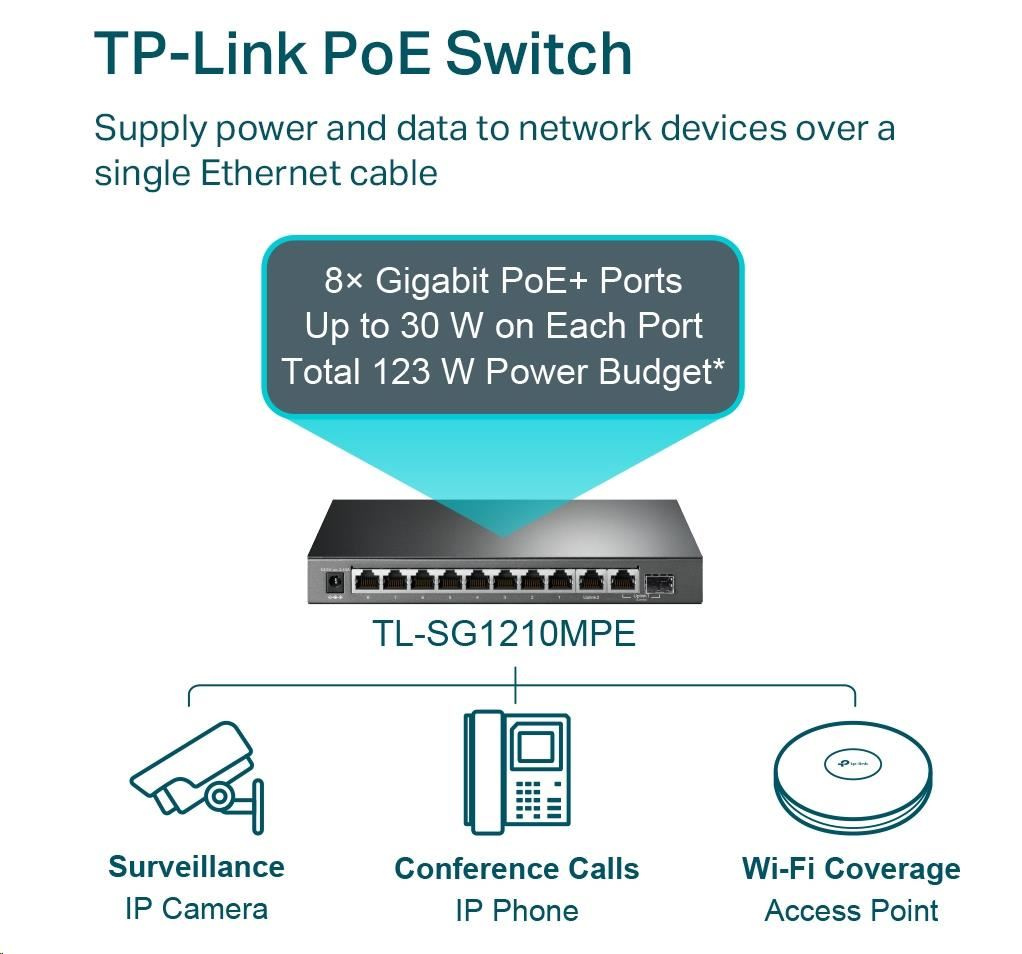 TL-SG1210MPE je plne kompatibilný so zariadeniami PoE, ako sú IP kamery, body prístupu a IP telefony. Môže byť tiež použitý na káblové pripojenie zariadení bez PoE, ako sú počítače, tlačiarne a IPTV.