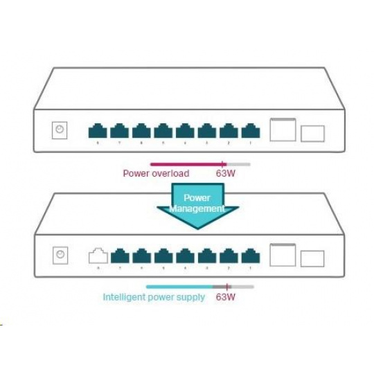 | PoE porty (RJ45) | Štandard: 802.3at/802.3af kompatibilné PoE porty: Port1 - Port 8 PoE rozpočet: 63W |