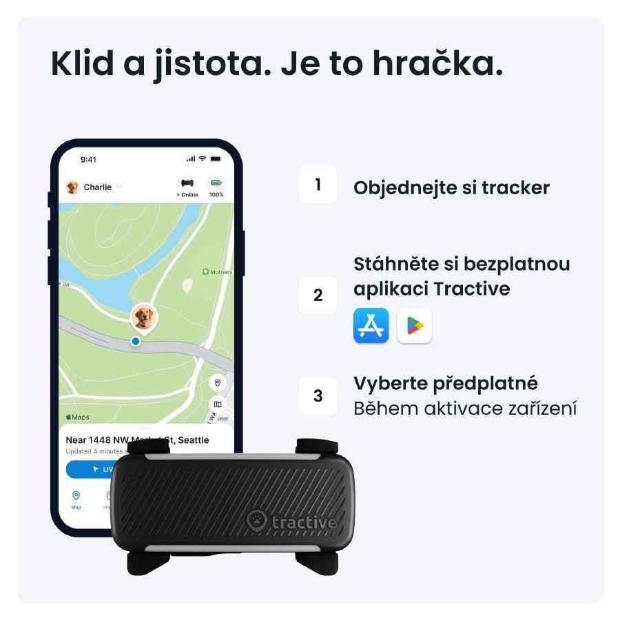 Zabezpečte svojmu psovi bezpečie a zdravie s Tractive DOG 6: výkonným univerzálnym GPS obojkom pre psov, ktorý vám v reálnom čase ukáže, kde presne pes je, sleduje jeho spánok a aktivitu a ponúka radu ďalších funkcií. GPS lokátor pre psov má v Českej republike a v ďalších viac ako 175 krajinách neobmedzený dosah vďaka integrovanému SIM karte, ktorá sa pripojí k akejkoľvek partnerskej sieti (je potrebná možnosť pripojenia k mobilnej sieti). Vyberte si predplatné, ktoré pokrýva náklady. Môžete si zvoliť predplatné na mesiac, 1, 2 alebo 5 rokov už od 90 Kč / mesiac*.*Cena s predplatným na 2 roky a jednorazovou platbou vopred. Ceny sa môžu zmeniť. Najnovšie informácie nájdete na adrese tractive.com/plans.