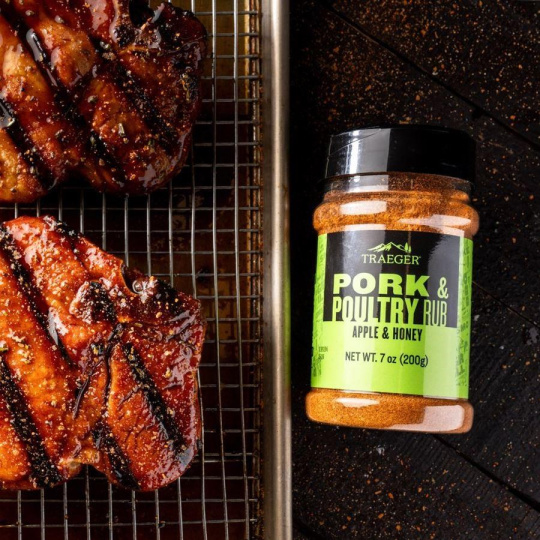 Od bravčových rezňov po kuracie na rožni – podávajte všetkým druhom bieleho mäsa extra dávku chuti s korením Traeger Pork & Poultry Rub. Paprika, cibuľa a chilli papričky pridávajú pikantnú chuť, zatiaľ čo jablko a med pridávajú nádych sladkosti, ktorá sa dokonale hodí k bravčovému, kuraciemu a ďalším jemnejším druhom mäsa.
