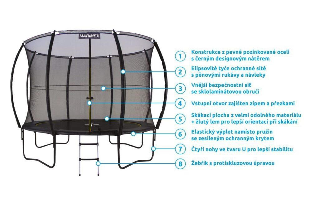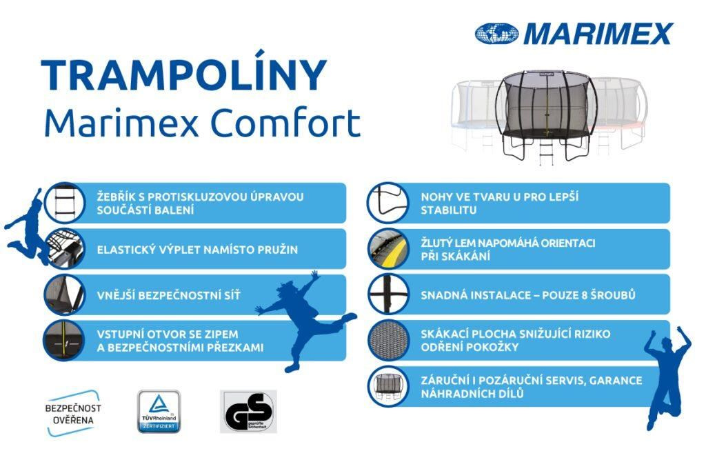 Bezpružinová trampolína Marimex Comfort je výnimočná vďaka novej technológii upevnenia skákacej plochy do rámu. Elastický výplet namiesto pružín je bezpečnejší, zvyšuje flexibilitu odrazovej plochy a spôsobuje mäkší dopad. Orientáciu pri skákani pomáha žltý lem na odrazovej ploche. Bezpečnostná sieť na vonkajšej strane trampolíny je pružná a zároveň výborne drží tvar. Inštalácia kovovej konštrukcie aj siete je veľmi jednoduchá, obsahuje iba 16 skrutiek. Dokonalú stabilitu zabezpečujú 4 nohy v tvare písmena U. Výhody trampolín Marimex Comfort Elastický výplet namiesto pružín - bezpečný systém a mäkší dopad Jednoduchá inštalácia - iba 16 skrutiek Žltý lem - pomáha orientácii pri skákani Odrazová plocha Materiál odrazovej plochy patrí k najkvalitnejším na trhu. Plocha je vyrobená zo špeciálneho polypropylénu s ochranou proti UV žiareniu, čo zaručuje dlhú životnosť. Špeciálna neabrazívna (hladká) povrchová úprava zabráni odreniu pokožky pri dopade. Vonkajšia ochranná sieť Ochrannú sieť nájdete priamo v balení, nemusíte si ju dokupovať zvlášť. Ochranná sieť na vonkajšej strane trampolíny je pružná a zároveň výborne drží tvar. Tyče sú obalené ochranným návlekom z mäkčenej peny. Nohy trampolíny sú samostatné a zvyšujú stabilitu celej trampolíny. Zvonku aj zovnútra sú galvanizované rúry rámu. Parametre ochrannej siete materiál - polyester, čierna priemer ochrannej siete - 366 cm výška ochrannej siete - 180 cm priemer tyče ochrannej siete - 25,4 mm hrúbka tyče ochrannej siete - 1,2 mm hrúbka trubky rámu: 38 x 1,5 mm hrúbka krytu rámu: 13 mm návlek tyče ochrannej siete - mäkčená pena vrchná obruba ochrannej siete - sklolaminátová tyč Materiál a zloženie ochranných prvkov Trubky a stojky: pozinkovaná oceľ Skákacia plocha: PP (polypropylén) Ochranná sieť: PE (polyetylén) Ochranný lem skákacej plochy: EPE (expandovaný polyetylén) + vnútorné vypchávky: PE (polyetylén) Bezpečnosť Trampolíny sú určené na náročné pohybové aktivity, preto kladieme dôraz na ich bezpečnosť a spoľahlivosť. Použitie kvalitných materiálov a moderných technológií pri výrobe radí naše trampolíny medzi najbezpečnejšie a najspoľahlivejšie na českom trhu. K tomuto produktu odporúčame dokúpiť položku 19000730 - Sada kotviace s kovovou sponou (3 ks vrtákov)-trampolína. Rozmery trampolíny Priemer trampolíny: 366 cm Priemer skákacej plochy: 312 cm Výška skákacej plochy: 82 cm Výška vrátane ochranné siete: 265 cm Max. zaťaženie: 150 kg Počet nôh: 4 Parametre ochrannej siete Materiál: Polyester, čierna Priemer ochrannej siete: 366 cm Výška ochrannej siete: 180 cm Priemer tyče ochrannej siete: 25,4 mm Hrúbka tyče ochrannej siete: 1,2 mm Návlek tyče ochrannej siete: Mäkká pena Vrchná obruba ochrannej siete: Sklolaminátová tyč Parametre trampolíny Počet tyčí: 8 Ochranná sieť vrchná: Áno Ochranná sieť spodná: Nie Rebrík: Áno Logistické údaje Počet kartónov: 2 Rozmery a hmotnosť balíka: 148 x 44 x 33 cm, 47,10 kg 116 x 40 x 22 cm; 22,80 kg Odhadovaná doba montáže: 90 minút
