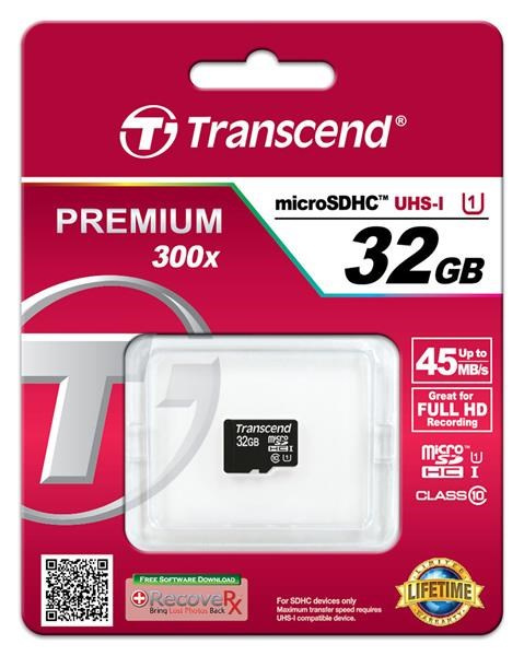 Karta TRANSCEND MicroSDHC 32GB Premium, Class 10 UHS-I 300x, bez adaptéra