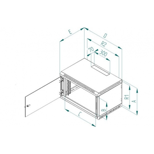 Rozvádzač Delta B je celozváraný nástenný jednodielny rozvádzač s celosklenenými dverami, ktoré sa vďaka masívnym závesom dajú otvoriť v uhle takmer 180°. Dôležitou súčasťou výrobku sú otvory na káble, ktoré sa nachádzajú na hornej a dolnej stene. Ďalšie dva otvory sa nachádzajú na zadnej stene rozvádzača. Otvory sú utesnené vylamovacími zátkami, ktoré sa dajú vylomiť napr. skrutkovač. 19" zariadenia sú nainštalované na vertikálnych koľajniciach, ktoré sa dajú plynule prispôsobiť hĺbke tela skrine. Perforácia zabezpečuje prirodzenú cirkuláciu vzduchu a chladenie komponentov. Presné rozmery a ďalšie technické údaje sú uvedené nižšie (hodnoty R1 a R2 označujú vzdialenosť montážnych otvorov na zavesenie rozvádzača na stenu). Maximálne zaťaženie skrinky je 30 kg. Rozmery: A - 500 mm B - 395 mm C - 490 mm D - 600 mm E - 395 mm R1 - 454 mm R2 - 420 mm Hmotnosť - 17,4 kg Balenie: Kľúč - predné dvierka 2x Skrutka 6x50 4x Podložka 6,6 4x Hmoždinka 10 4x Plastová podložka 8x Plávajúca matica M6 8x Skrutka M6x16 8x Prachová krytka 1x..