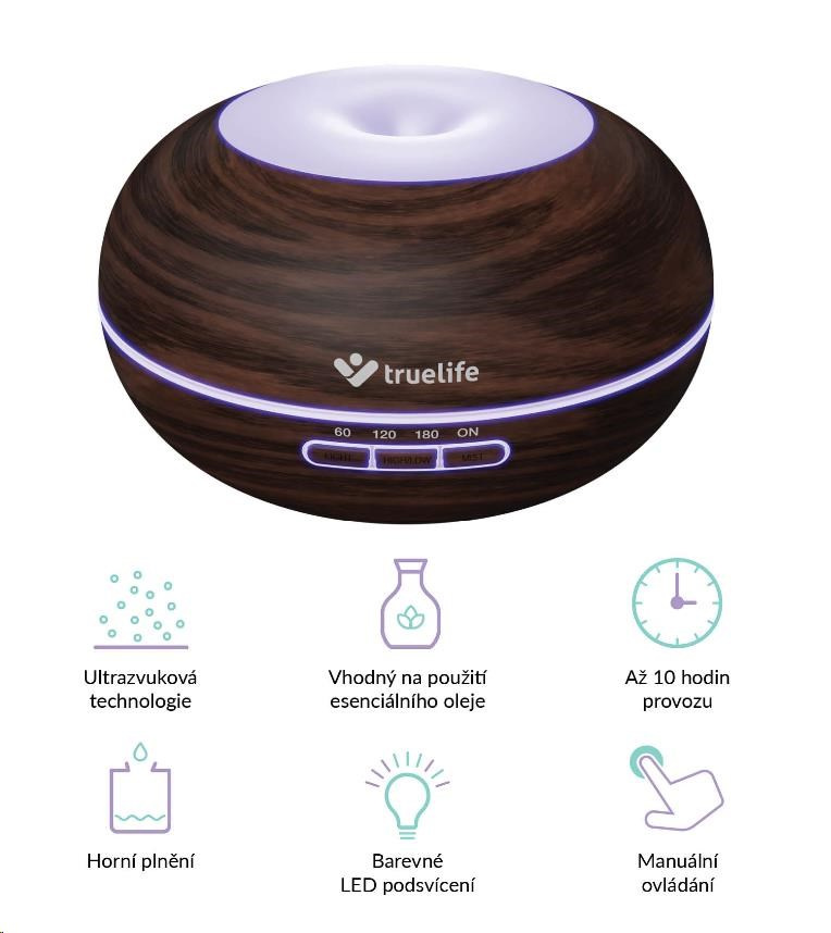 Difuzér Truelife provoní vzduch v miestnosti behom chvíle, stačí do nádržky pridať pár kvapiek esenciálneho oleja. Či už ste milovníkmi aromaterapie, chcete si vytvoriť príjemnú relaxačnú atmosféru alebo vás trápia nepríjemné pachy z okolia, difuzér pre vás bude ideálnym pomocníkom. Funguje na princípe ultrazvuku, ktorý mení vodu v nádržke na jemnú paru. Na výber máte zo 14 variantov farebného LED podsvietenia. Určite vás poteší aj svojím originálnym, no nadčasovým dizajnom.
