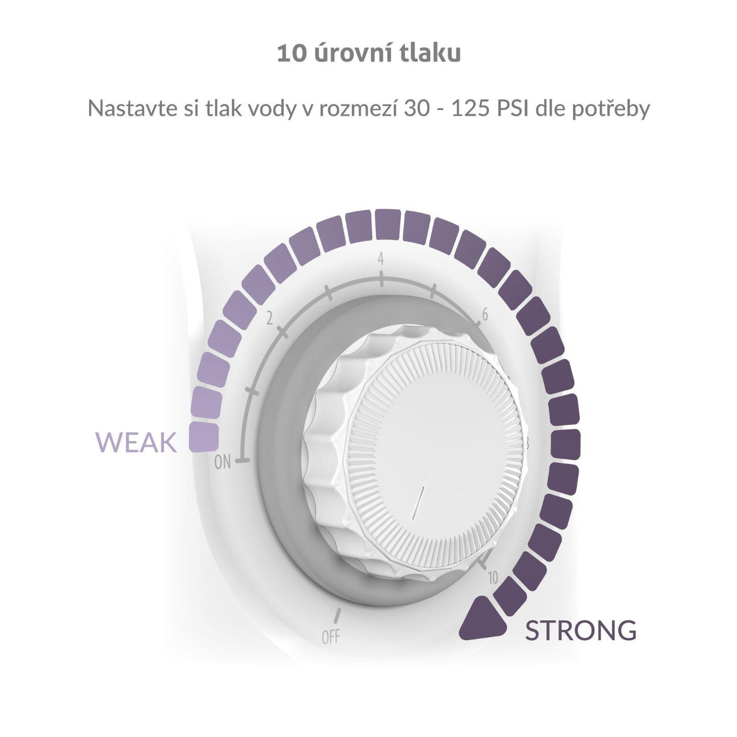 U AquaFloss Station S600 máte na výber z desiatich úrovní tlaku vody, v rozmedzí 30–125 PSI, čistenie zubov si tak môžete plne prispôsobiť. Požadovaný tlak si nastavíte pomocou kolieska na stanici. Súčasťou sprchy je 6 špeciálnych trysiek (3× Standard, 1× Orthodontic, 1× Periodontal, 1× Dental Plaque), navrhnuté pre rôzne potreby: