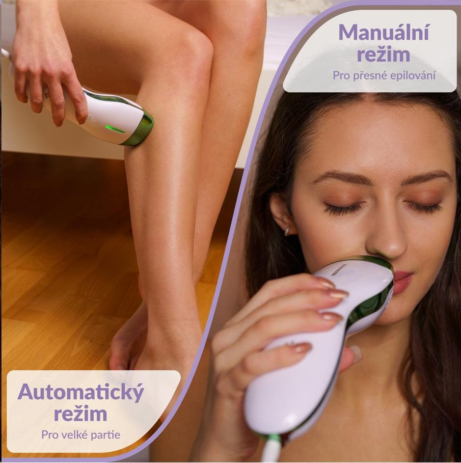 Epilátor TrueLife BELLE IPL E3 ponúka dva režimy. Manuálny režim jednotlivých zábleskov je vhodný na epiláciu malých a ťažko dostupných oblastí, ako sú tvár, podpažitie, oblasť bikín alebo členky. So automatickým režimom rýchlo a pohodlne ošetríte väčšie oblasti, napríklad nohy. Keď sa prístroj dotkne epilovanej oblasti, jednoducho podržíte tlačidlo ovládania na 3 sekundy, epilátor sa prepne do automatického režimu, kedy pri plynulom pohybe po pokožke bude neustále vydávať záblesky.