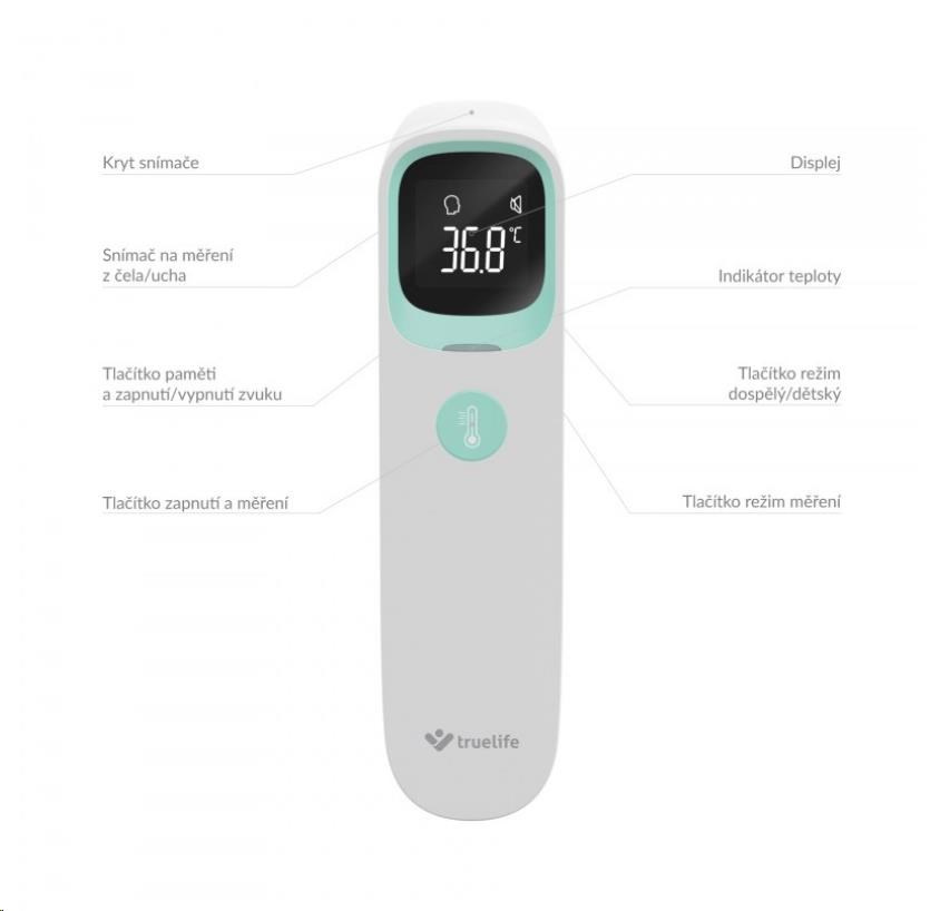 TrueLife Care Q10 BT ponúka tri režimy merania teploty. Okrem klasického merania telesnej teploty dokáže zmerať aj predmety, povrchy alebo tekutiny. Jednoducho tak môžete skontrolovať napríklad kojeneckú výživu alebo čaj. Pri meraní telesnej teploty osoby máte možnosť voľby medzi meraním z teploty z ucha alebo čela. Teplomer disponuje aj detským režimom, ktorý je prispôsobený pre osoby mladšie ako 12 rokov.