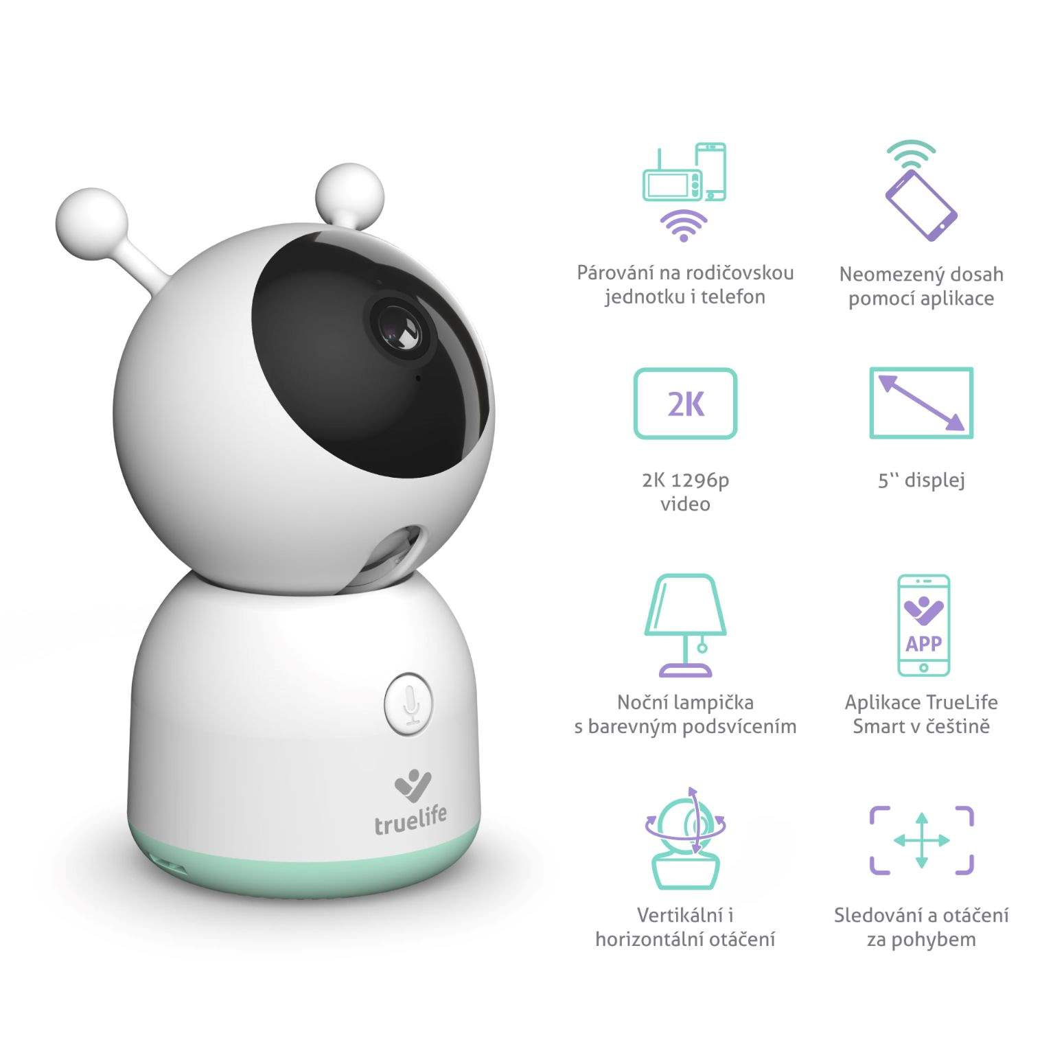 Rotačná pestúnka sa so svojim dizajnom skvele hodí do detskej izby – dieťa nijak neruší, naopak ho vie upokojiť. Prehrá uspávanky, dokáže napodobniť tlkot srdca alebo vďaka možnosti obojsmernej komunikácie môžete dieťatko upokojiť vlastným hlasom. K bezstarostnému spánku prispieva tiež funkcia nočnej lampičky s kompletným spektrom farebného podsvietenia a niekoľkými efektami. Flexibilné univerzálne uchytenie poskytuje širokú škálu možností na umiestnenie pestúnky. Balenie obsahuje súpravu pre uchytenie na stenu, prípadne je možné dokúpiť špeciálny držiak TrueLife NannyCam Holder, vďaka ktorému viete pestúnku pripevniť napríklad ku rámu postieľky. Ak je to potrebné, ku rodičovskej jednotke máte možnosť pripojiť ešte druhú kameru alebo ku aplikácii dokonca až 16 kamier.