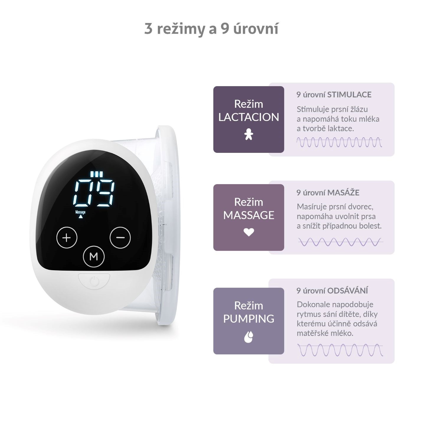 Odsávačka disponuje 3 režimami: Stimulácia napomáha toku mlieka a tvorbe laktácie, masáž prsného dvorca uvoľňuje prsia a znižuje prípadné bolesti, odsávanie dokonale napodobňuje rytmus sania dieťaťa pre účinné odsatie mlieka.
