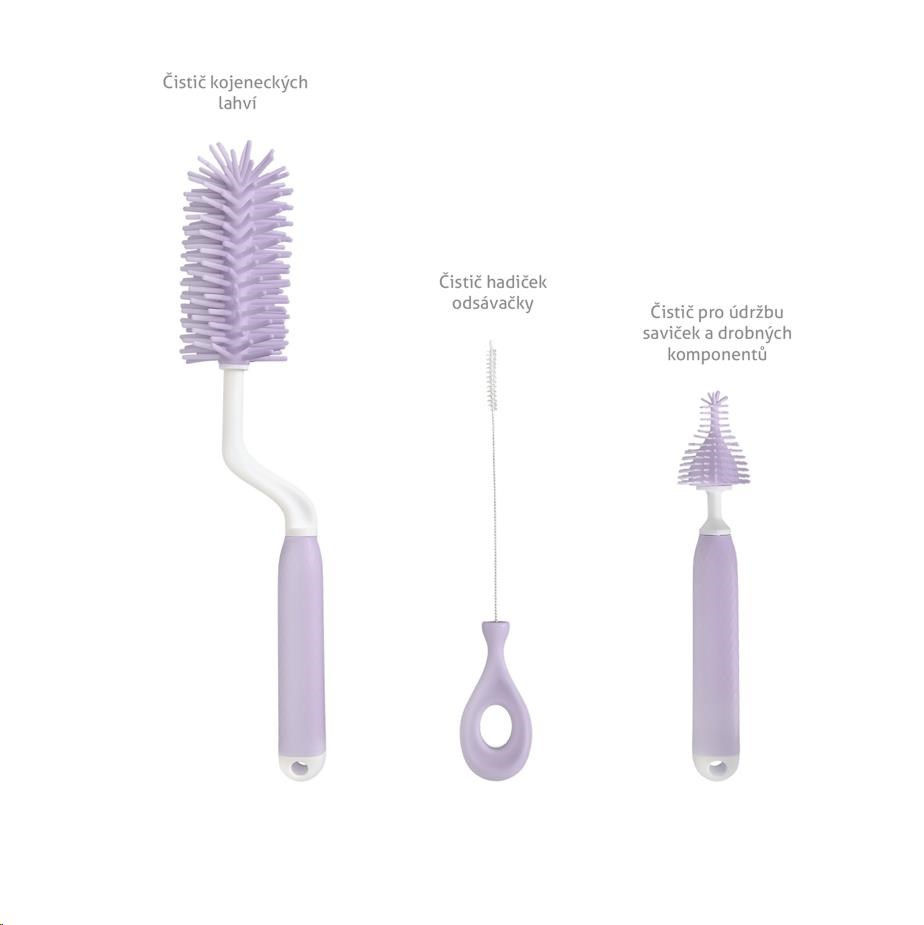 Pomocou setu na čistenie jednoducho zbavíte nečistôt najrôznejšie typy fliaš, cumlíkov, príslušenstva, ale aj ďalších predmetov pre deti. Nezáleží pritom na tom, z akého materiálu sú vyrobené, silikónové štetinky sú šetrné ku sklu, hliníku, keramike, plastu aj ďalším materiálom. Vďaka otočnej rukoväti sa navyše pri umývaní nijako nenadriete, minimalizuje totiž únavu rúk.