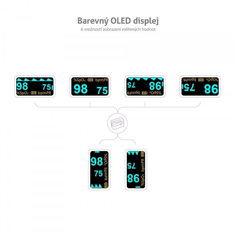 Oxymeter X3 disponuje prehľadným OLED displejom, ktorého nastavenie je možné prispôsobiť podľa vašich preferencií. Na výber je 6 možností zobrazenia meraných hodnôt. Môžete si nastaviť aj preferovanú intenzitu jasu, zvukový indikátor či zvukový doprovod tepu.