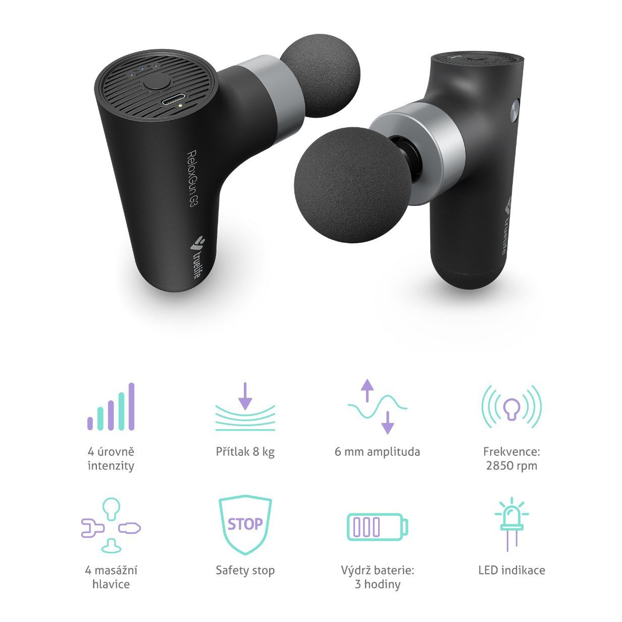 Či už športujete a potrebujete uvoľniť svoje vyťažené svaly, alebo máte sedavé zamestnanie a chcete pomôcť zmierniť napätie a bolesť, masážna pištoľ TrueLife RelaxGun G3 je pre vás to pravé. Z pohodlia domova vás vymasíruje, pomôže zregenerovať svaly, zlepší prietok krvi a uvoľní kŕče. Jednoducho si vyberte jednu zo 4 vymeniteľných hlavíc a zvoľte jednu zo 4 intenzít masáže. Malé, ľahké telo, ktoré dobre padne do ruky, má prítlak 8 kg a frekvenciu pohybu až 2850 pohybov za minútu. Amplitúda je 6 mm. Bezpečné používanie zabezpečuje funkcia Safety stop, ktorá spomalí alebo vypne stroj, ak je vyvíjaný príliš veľký tlak. Po 15 minútach používania sa automaticky vypne. Nabíjateľná lítiová batéria zvládne až 3 hodiny prevádzky.