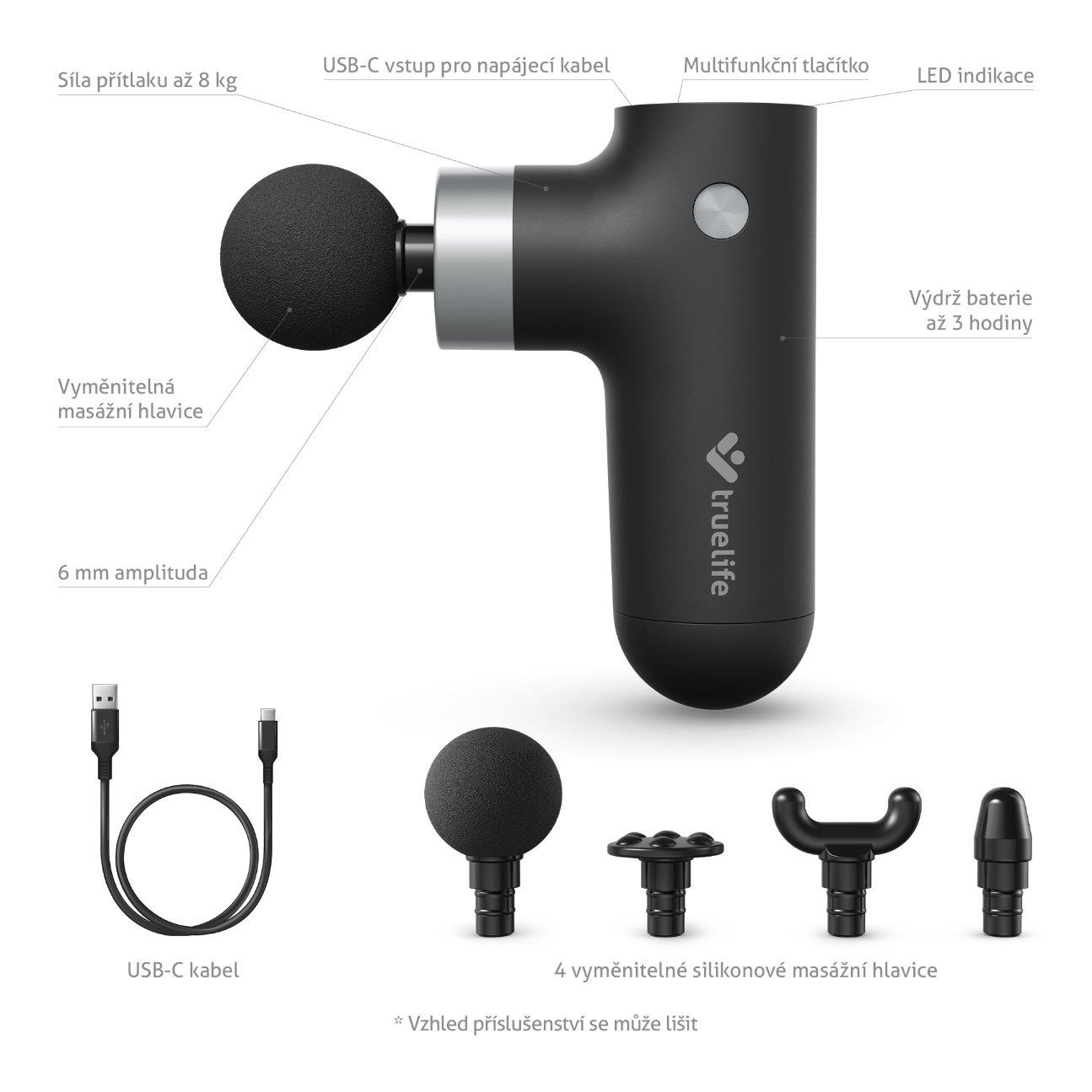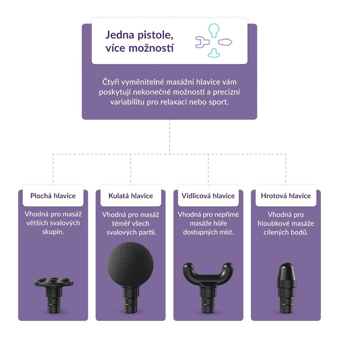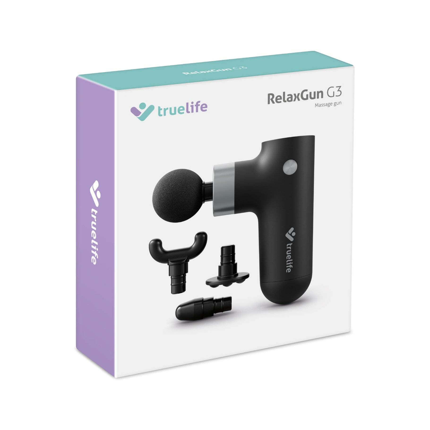 TrueLife RelaxGun G3 má 4 masážne hlavice, z ktorých každá má svoje špecifické použitie. Hlavica Flat Head je jednou z najpoužívanejších hlavíc, pretože jej plochá štruktúra je vhodná na masírovanie väčších svalových skupín, ako sú chrbát alebo stehná. Vidlicová hlavica Fork Head sa vyznačuje dvoma úzkymi špičkami, ktoré masírujú ťažko dostupné miesta, ako sú trapézy alebo zápästia. Hlava sa dokonale prispôsobí kontúram tela a je vhodná aj na masáž hlbokých svalov. Guľatú hlavicu Ball Head možno použiť takmer na všetky svalové partie, pretože vďaka svojmu tvaru sa prispôsobí telu. Účelom hrotovej hlavice Bullet Head je masáž špecifických bodov na tele, tzv. trigger pointov.