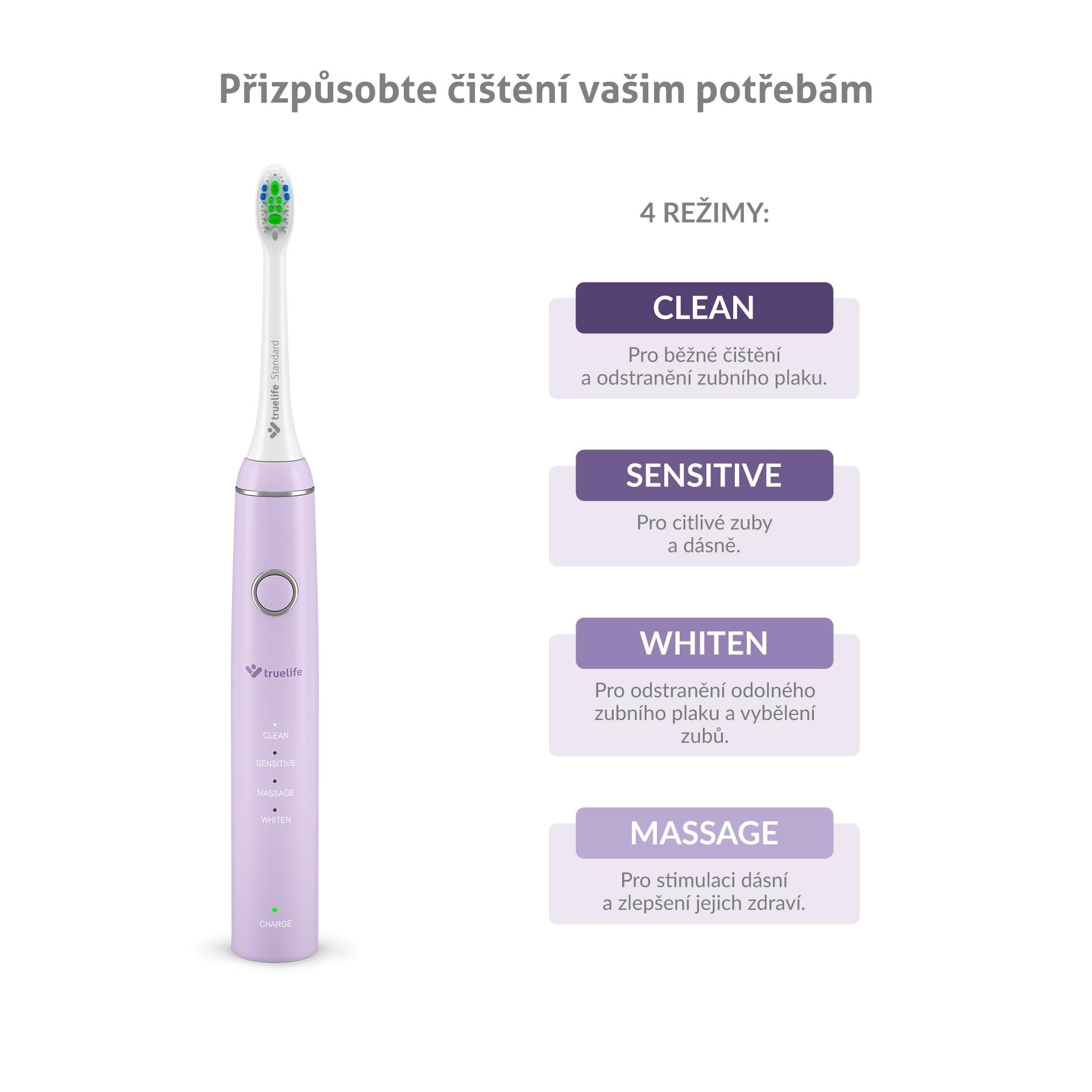 Kefky zo sady TrueLife SonicBrush Compact Duo ponúkajú 4 režimy čistenia, ktoré sa komplexne postarajú o vaše ústa. Režim Clean je najbežnejší a hodí sa pre každodenné používanie. Citlivé zuby a ďasná môžete s pokojom zveriť režimu Sensitive. K krásnemu bielemu úsmevu vám pomôže režim Whiten a príjemnú masáž ďasien zabezpečí režim Massage.