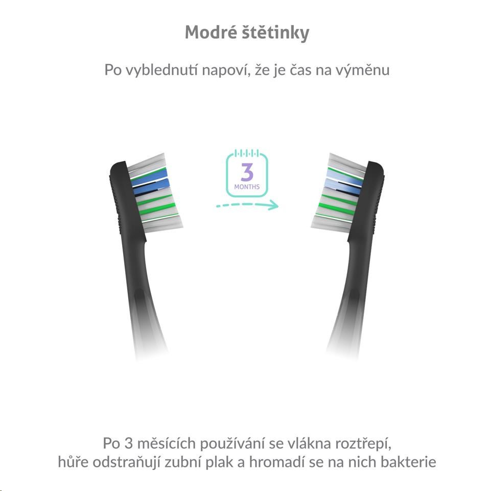 Hlavice vydržia až 3 mesiace používania, potom sa začnú lámať, strácajú účinnosť a navyše sa na nich hromadia baktérie. Našťastie sú hlavice opatrené modrými štetinkami, ktoré po 3 mesiacoch vyblednú a tak viete, že je načase hlavice vymeniť.