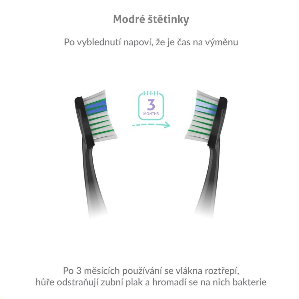 Hlavice vydržia až 3 mesiace používania, potom sa začnú tierať, strácajú účinnosť a navyše sa na nich hromadia baktérie. Našťastie sú hlavice vybavené modrými štetinkami, ktoré po 3 mesiacoch vyblednú a tak viete, že je načase hlavice vymeniť.