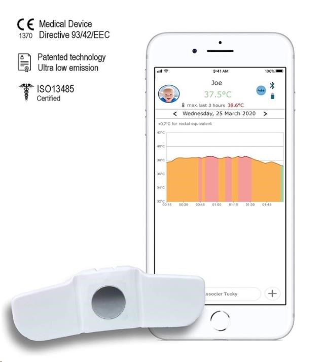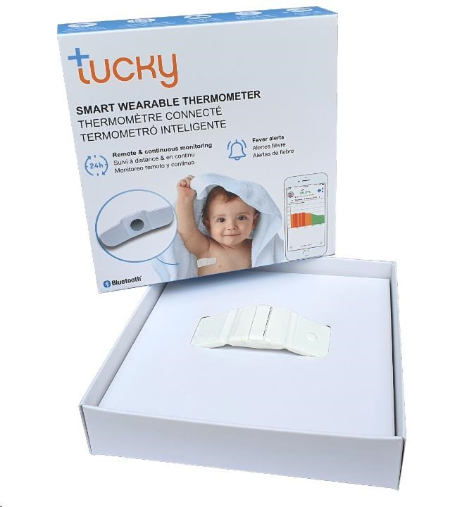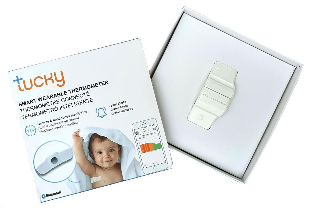 TUCKY – inteligentný teplomer a monitor polohy prináša riešenie tejto situácie. Certifikovaný pre lekárske použitie, jednoducho ho nalepte pod pravú ruku vášho malého pacienta a TUCKY mu každú minútu presne zmeria teplotu a odošle meranie do vášho zariadenia so systémom iOS/Android. Teplotu môžete neustále sledovať, alebo sa môžete spoľahnúť naautomatické upozornenie až vtedy, keď teplota dosiahne určitú hodnotu , a okamžite podať lieky na zabitie horúčky. TUCKY ušetrí vaše dieťa pred nepríjemným utrpením s horúčkou a dodá vám väčší pokoj.