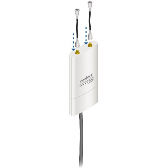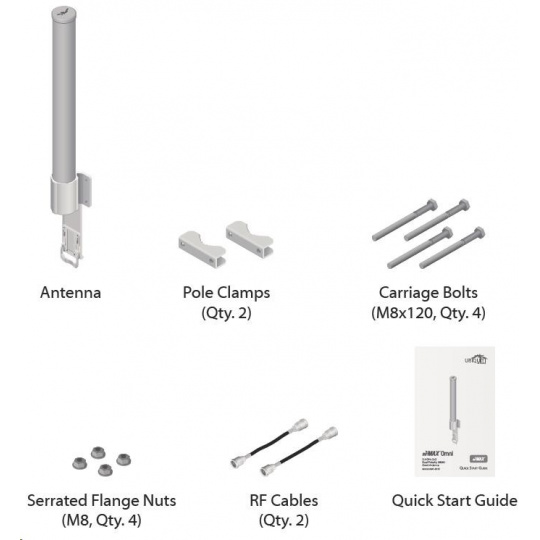 je to robustné 10dbi všesmerové anténne riešenie pre prístupové body pracujúce v pásme 2.4GHz a pomocou 802.11n v kombinácii s technológiou MIMO. Anténa má dva konektory RSMA typu žena. Súčasťou dodávky sú dva vodotesné pigtaily RSMA na pripojenie k jednotke Rocket M2, držiak pre túto jednotku a montážna súprava na stožiar, pozri. obr.