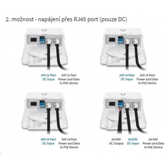 fiberPOE obsahuje 2 ethernetové porty, 1 SFP slot a DC svorkovnicu. Na napájanie konvertora sú k dispozícii celkom 3 možnosti: prvá je DC svorkovnica, druhá a tretia sú cez porty RJ45. Prevodník preto môže byť napájaný z oboch ethernetových portov, ale dáta prenáša len port označený ako POE. Všetky 3 možnosti pracujú v rozsahu 16 až 50 V DC.