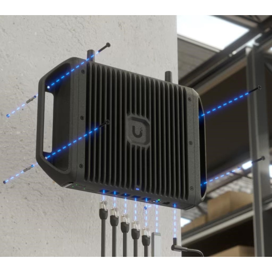 Ruggedized, fanless 10 GbE UniFi Cloud Gateway delivering 350W of total system power for high-density PoE deployments, with advanced routing capabilities and microSD storage for full UniFi application support..