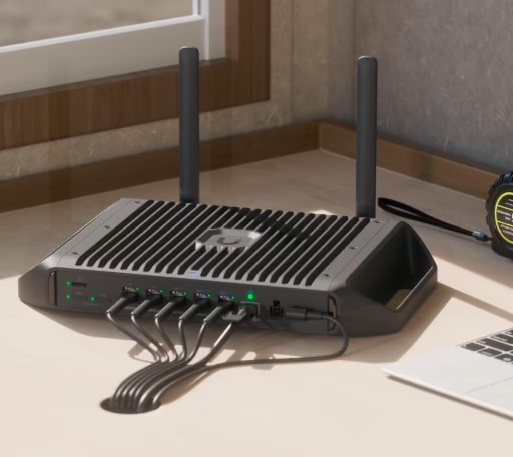 Ruggedized, fanless 10 GbE UniFi Cloud Gateway delivering 350W of total system power for high-density PoE deployments, with advanced routing capabilities and microSD storage for full UniFi application support..