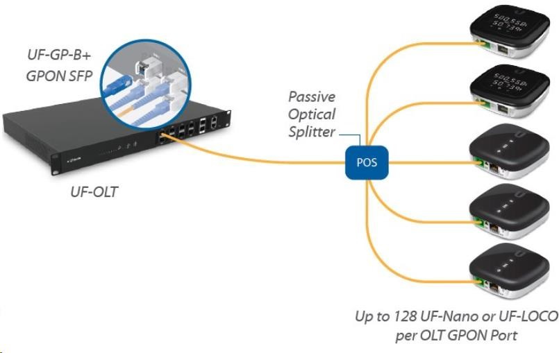 k 1 portu GPON možno pripojiť až 128 jednotiek CPE na vzdialenosť až 20 km. UF-LOCO je kompatibilný s UF-OLT a tiež s niektorými jednotkami OLT od iných výrobcov.