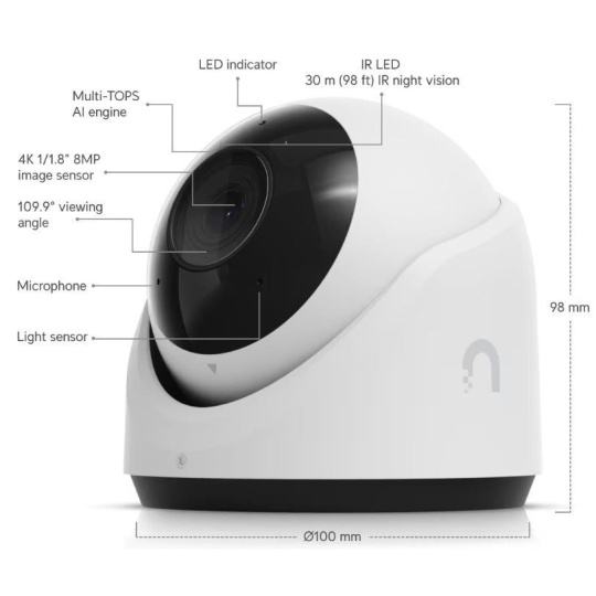 Popis produktu UniFi G6 Turret kamera disponuje 8MP snímačem s rozlišením 3840 x 2160 při 30fps a objektivem s pozorovacím úhlem 109.9°, který je vybaven IR přísvitem pro noční vidění do vzdálenosti 30m. Dále je kamera vybavena mikrofonem pro záznam zvuku, 10/100 Mbps LAN portem s podporou PoE a stupněm krytí IP66 pro použití ve venkovním prostředí. Kameru je možné napájet pouze prostřednictvím PoE adaptéru nebo switche podporující standard 802.3af a pasivní PoE (36-57V DC). Maximální spotřeba kamery je 12,5W! AI funkce Díky implementaci AI kamera podporuje pokročilé detekce jako jsou detekce obličeje, detekce SPZ nebo chytré rozpoznání objektů (osoba, vozidlo, zvíře). Důležité vlastnosti • 8MP, 30 FPS video • AI chytré detekce • Noční režim s IR LED diodami • IP66 kryt odolný proti povětrnostním vlivům • Vestavěný mikrofon • Spravováno softwarem UniFi Protect • Odolnost vůči vandalům - IK04 Obsah balení • Zařízení • Šroubky + hmoždinky • Držák pro přichycení ke zdi • Technické parametry • Kamera • Typ objektivu:Fixní • Přísvit:IR • Dosah přísvitu [m]:30 • Pozorovací úhel [°]:110 • Režim den/noc:IR cut filtr • Obrazový senzor ["]:1/1.8 • Obraz • Rozlišení:8MP • Max. rozlišení [pixely]:3840 x 2160 (4K UHD) • Konektory a rozhraní • Audio:Mikrofon • Rychlost LAN:(1) 10/100Mbps • Napájení • Napájení přes PoE:802.3af, 37 .. 57V DC • Typ napájení:PoE • Max. spotřeba energie [W]:12,5 • Fyzické charakteristiky • Stupeň krytí:IP66 • Použití:Venkovní • Antivandal (ochrana proti nárazu):IK4 • Tlačítka:Reset • Provozní teplota [°C]:-30 až 50 • Hmotnost [g]:550 • Šířka [mm]:100 • Výška [mm]:100 • Hloubka [mm]:98 • Barva:Bílá • Obecné • Kamerová řada:UniFi Protect.