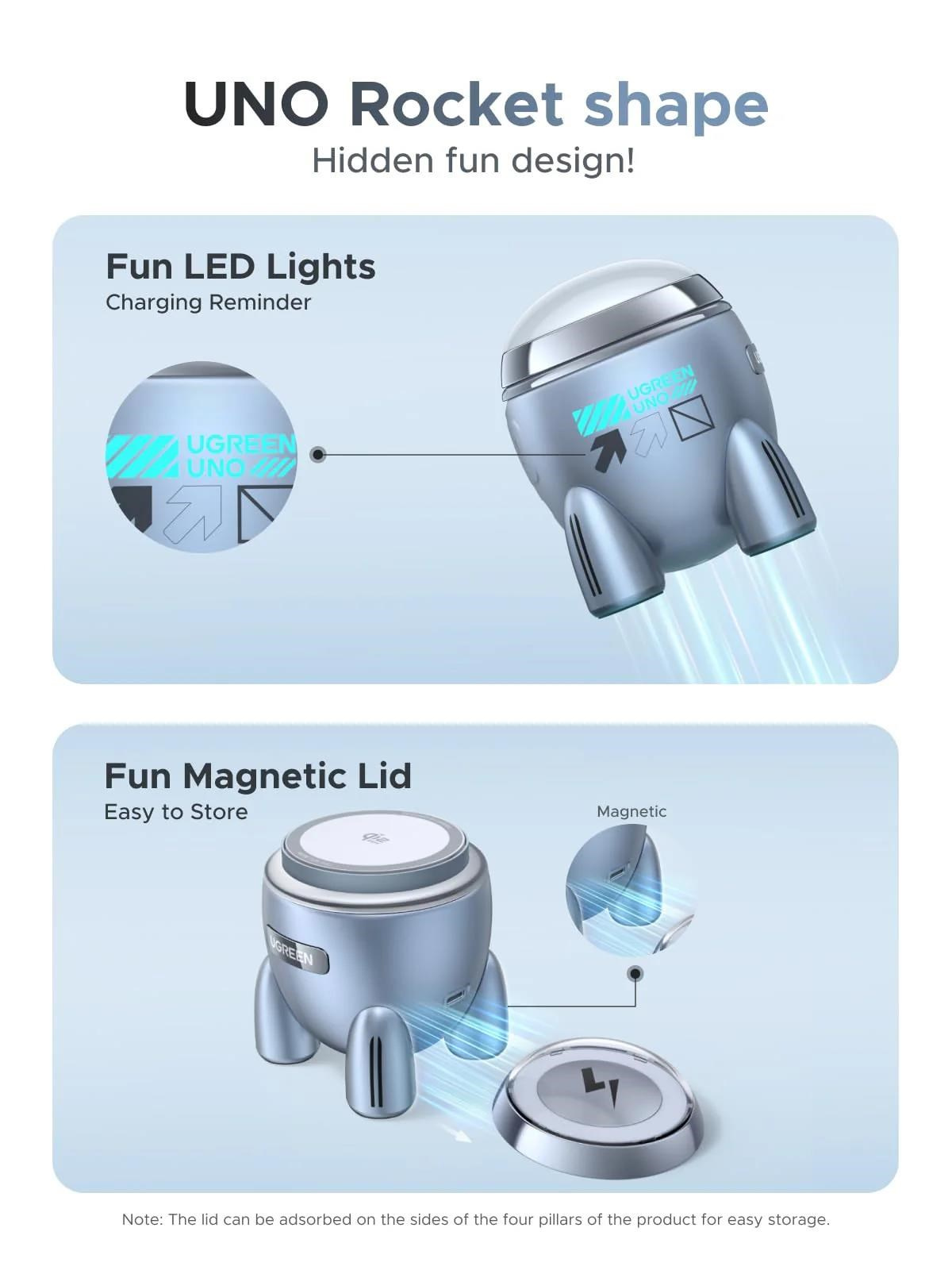 - Zábavný a praktický design: Unikátní design ve tvaru rakety kombinuje styl a funkčnost. Nabíječku lze naklopit od 0° do 55° a používat jako stabilní stojan, LED indikátory zobrazují stav nabíjení