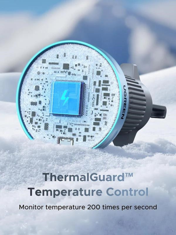 - Bezpečné nabíjení: Technologie ThermalGuard s NTC senzory monitoruje teplotu 200× za sekundu a spolu s 8 úrovněmi ochrany zabraňuje přehřátí, přepětí, zkratu a přebíjení