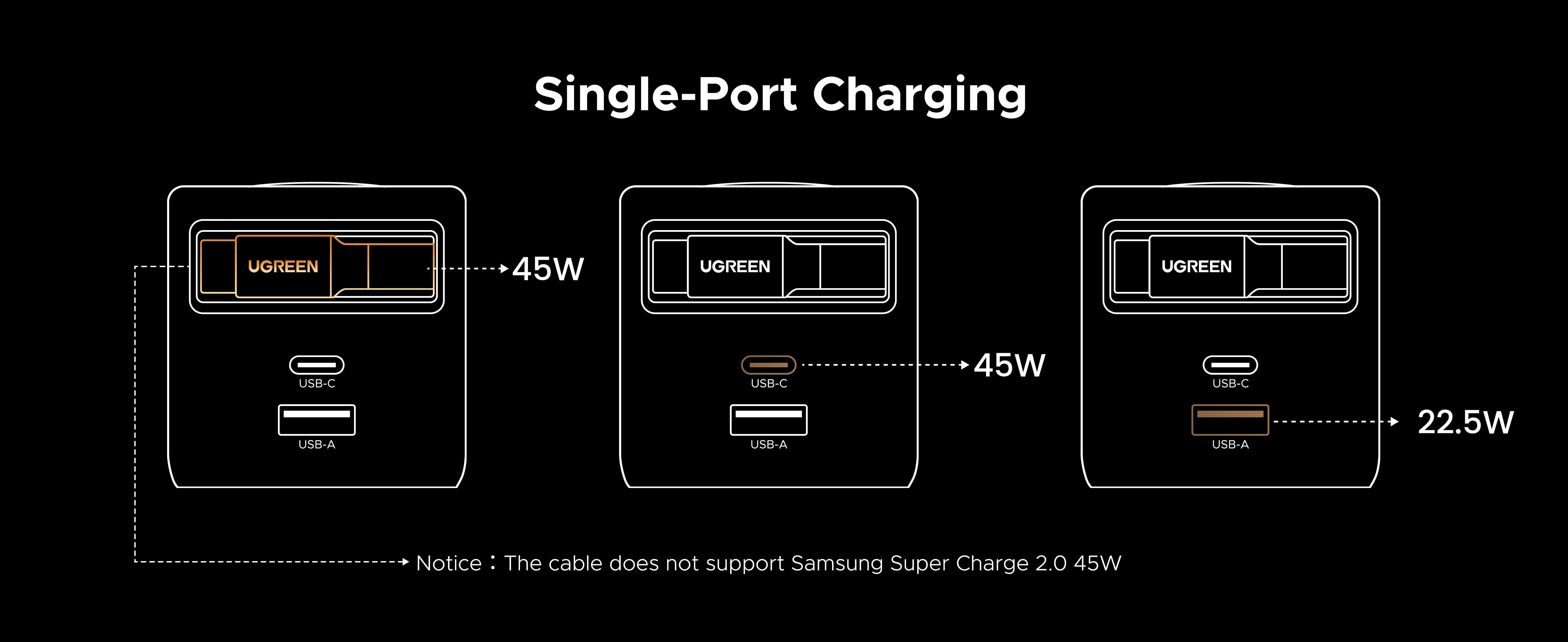 | Output | 45W Max USB-C1 kabel: 5V/3A , 9V/3A , 12V/3A , 15V/3A , 20V/2.25A 45W Max PPS:5-11V/2.75A USB-C2: 5V/3A , 9V/3A , 12V/3A , 15V/3A , 20V/2.25A 45W Max PPS:5-11V/4.5A USB-A: 5V/3A, 9V/2A, 12V/1.5A, 10V/2.25A 22.5W Max |