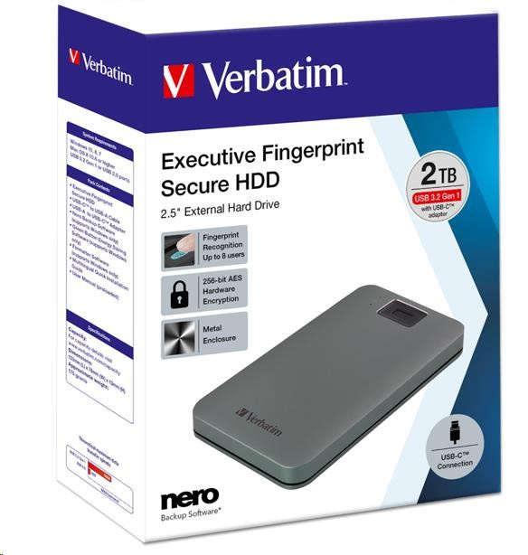 VERBATIM externý HDD 2.5" 1TB, Executive Fingerprint Secure, USB 3.2 Gen 1 / USB-C, sivá