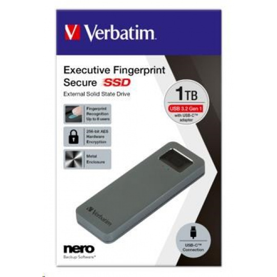 VERBATIM Externý SSD disk 1 TB, Executive Fingerprint Secure SSD, USB 3.2 Gen 1/USB-C, (W:356 MB/s, R:344 MB/s), sivá
