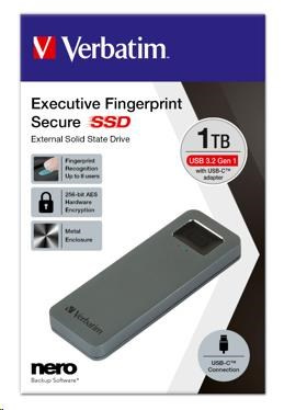 VERBATIM Externý SSD disk 512 GB, Executive Fingerprint Secure SSD, USB 3.2 Gen 1/USB-C, (W:356 MB/s, R:344 MB/s), sivá
