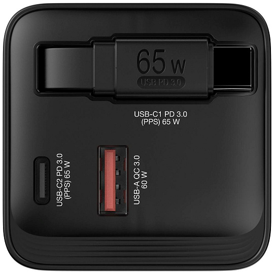 • 65W GaN nástěnná nabíječka se zatahovacím kabelem USB-C® PD 65W a 2 výstupními porty: 1 x USB-C PD 65W a 1 x USB-A QC 3.0