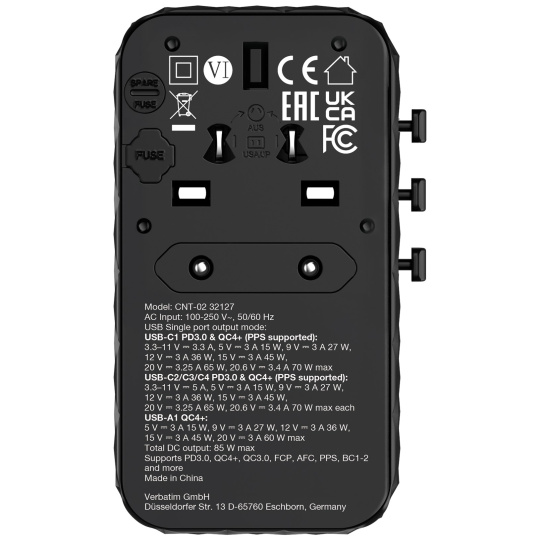Kompaktný a výkonný univerzálny cestovný adaptér Verbatim Charge 'n' Travel GaN III umožňuje nabíjať päť zariadení súčasne prostredníctvom elektrickej zásuvky, troch portov USB-C, portu USB-A a vysúvacieho kábla USB-C, pričom poskytuje celkový výkon 85 W. Dostatok na to, aby ste mohli ľahko nabíjať telefóny, tablety a ďalšie zariadenia.