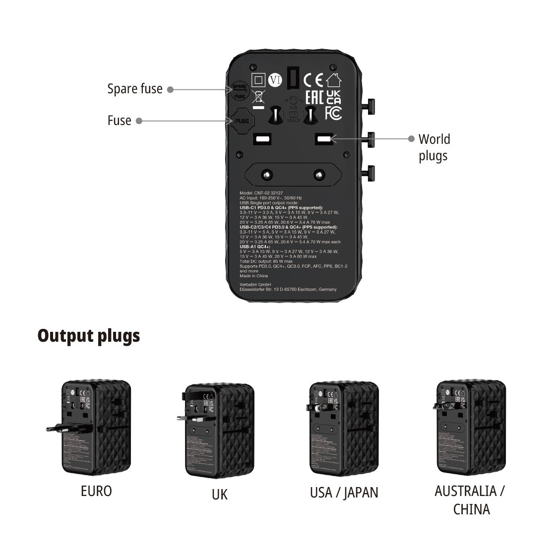 Kompaktný a výkonný univerzálny cestovný adaptér Verbatim Charge 'n' Travel GaN III umožňuje nabíjať päť zariadení súčasne prostredníctvom elektrickej zásuvky, troch portov USB-C, portu USB-A a vysúvacieho kábla USB-C, pričom poskytuje celkový výkon 85 W. Dostatok na to, aby ste mohli ľahko nabíjať telefóny, tablety a ďalšie zariadenia.