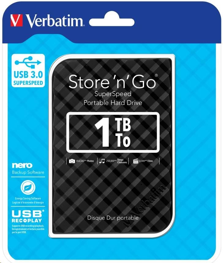 VERBATIM HDD 2.5" 1TB prenosný pevný disk Store 'n' Go USB 3.0, čierna Špeciálne funkcie: Dostupné farby: čierna, strieborná, biela, červená a modrá Dostupné kapacity: 500 GB, 1 TB a 2 TB Vysokorýchlostné úložisko s vysokou kapacitou. Rýchle a bezpečné riešenie na rozšírenie úložiska alebo zálohovanie súborov USB 3.0 SuperSpeed - pre veľmi rýchly prenos dát Nero Backup Software Softvér na úsporu energie USB REC & PLAY* - podporuje nahrávanie/prehrávanie cez USB 2 roky obmedzená záruka** Systémové požiadavky: PC alebo Mac s USB 3.0 Windows XP / Vista / Windows 7 a 8 Mac OS X 10.4 alebo vyššia Obsah balenia: Prenosný pevný disk / USB 3.0 Kábel / Nero Backup Software / Green Button Energy Saving Software / Verbatim Formatter / Quick Start Guide / User Guide (predinštalovaný na disku)..