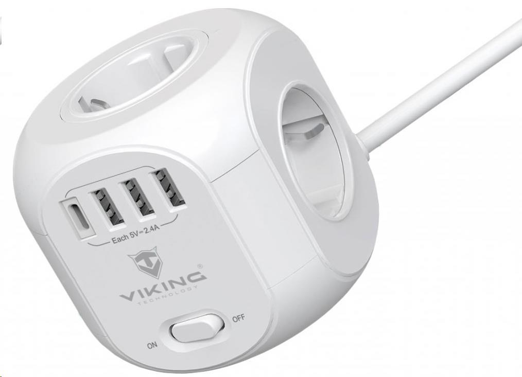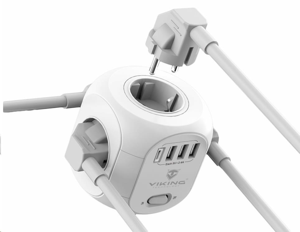 Vďaka šírom 4 AC zásuvkám, 3 portom USB-A a jednému USB-C portu umožňuje Viking AC Cube súčasné napájanie až ôsmich zariadení. Už nikdy nebudete musieť hľadať voľnú zásuvku alebo USB port.