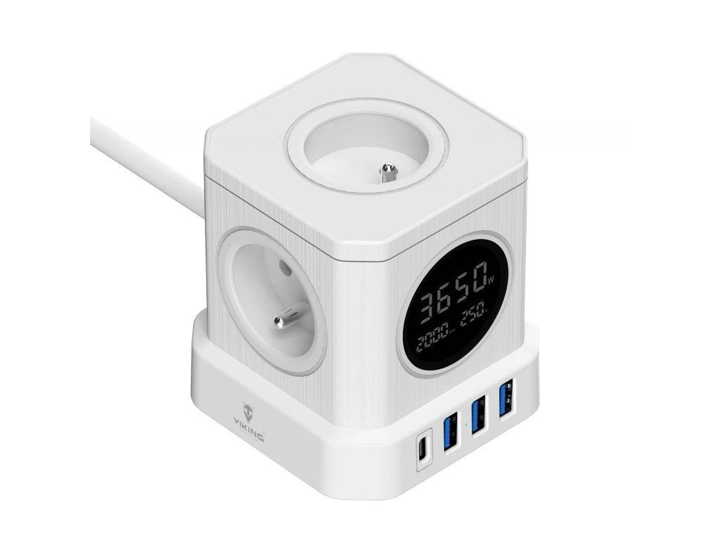 Síťový adaptér Viking ACT44 kombinuje štyri USB porty (3× USB-A a 1× USB-C), štyri AC zásuvky a 2m predlžovací kábel v jednom kompaktnom zariadení. Ušetrí miesto a umožňuje napájať až osem zariadení súčasne.