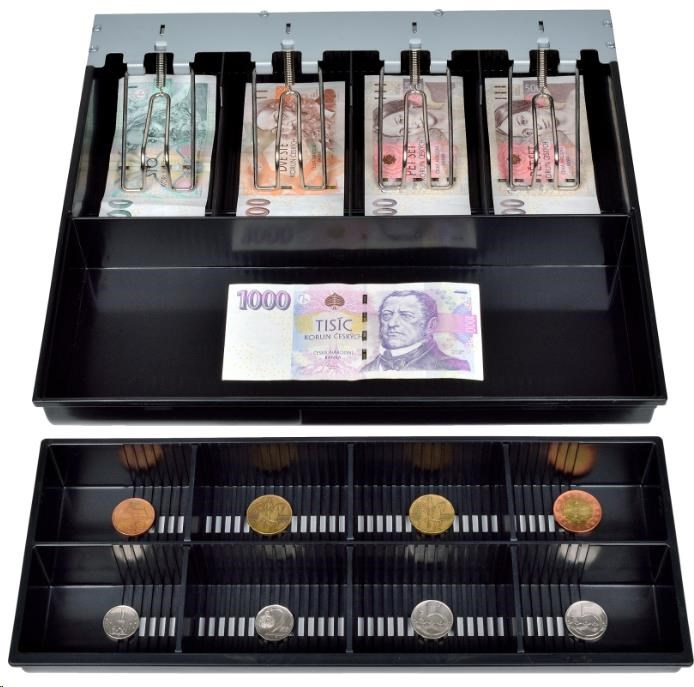 | Prihrádky | 4× na bankovky 8× na mince - vyberateľný mincovník |