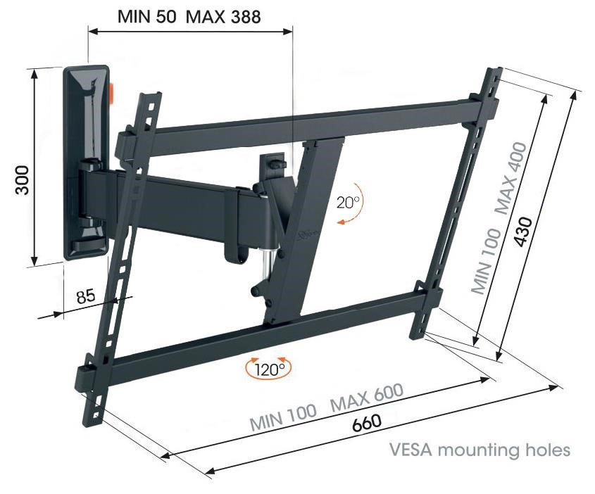Chcete si vychutnať svoj veľký plochý televízor bez akýchkoľvek starostí. S držiakom TVM 3623 radu COMFORT Full-Motion TV to zvládnete. Váš televízor bude na stene upevnený štýlovo a bezpečne. Nástenný držiak je špeciálne navrhnutý pre intenzívne používanie s ohľadom na rodiny s deťmi. Nastavenie dokonalého pozorovacieho uhla? Žiadny problém. Televízor môžete natočiť až o 120° (záleží na šírke TV) a nakloniť až o 20°. Nástenný držiak je vhodný pre televízory s uhlopriečkou 40 až 77 palcov a hmotnosťou do 35 kg.