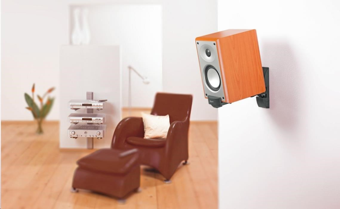 Nástenný držiak bez nutnosti vŕtania do reproduktorovej skrinky, ktorá je upnutá čeľusťovým mechanizmom. Ideálne pre stredne veľké regálové reproduktory