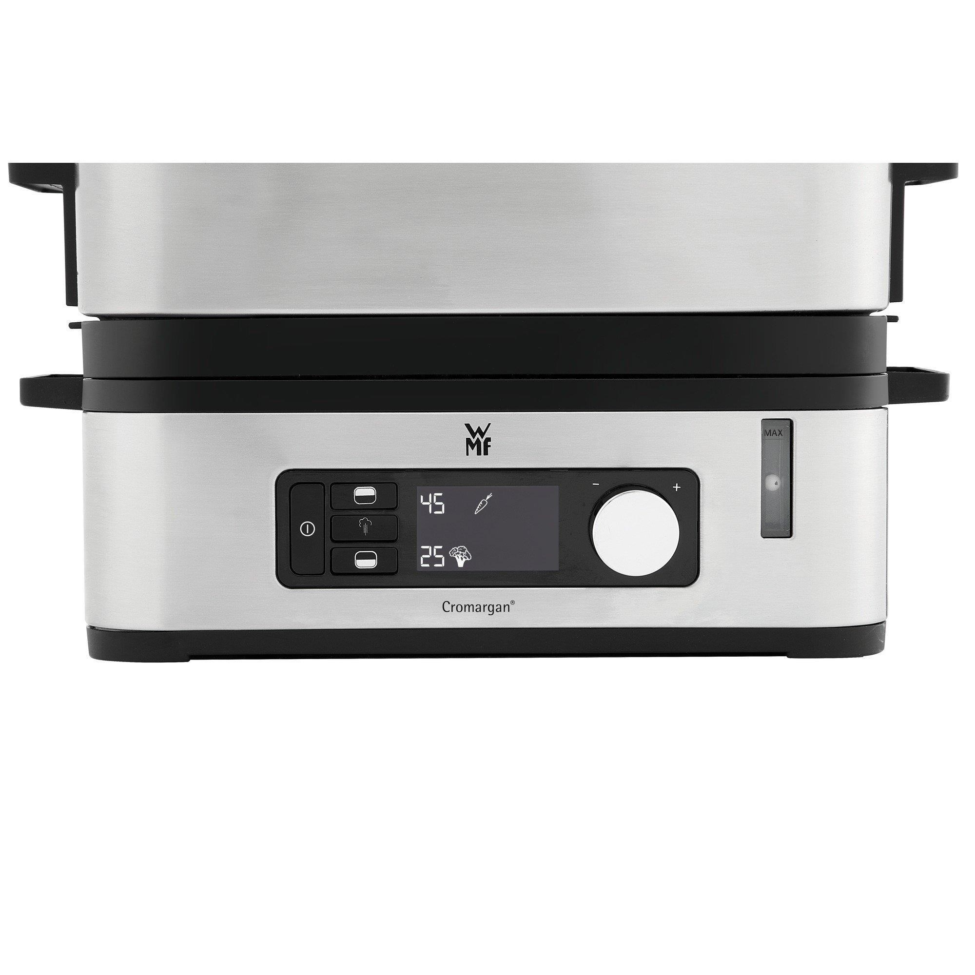 Parný hrniec WMF KITCHENminis® vyrobený z nerezovej ocele Cromargan® s kvalitným sklom víkom plní, čo sľúbil. Má kompaktný dizajn, je vhodný na zdravé varenie, neobsahuje bisfenol A a nie je viazaný na varič. Ide o najmenší systém na varenie z nerezovej ocele Cromargan® s rozmermi len 14,4 x 28,4 cm s výkonom 900 wattov, ktorý umožňuje pripravovať súčasne mäso, ryby, zeleninu a prílohy na dvoch plochách. Dokonalé varenie: vďaka technológii WMF Easy Steaming so dvomi samostatnými plochami na prípravu pokrmov, ktoré je možné samostatne nastaviť, môžete variť všetko naraz. Samotný proces varenia však začína neskôr podľa toho, ako ho nastavíte.