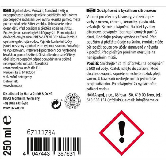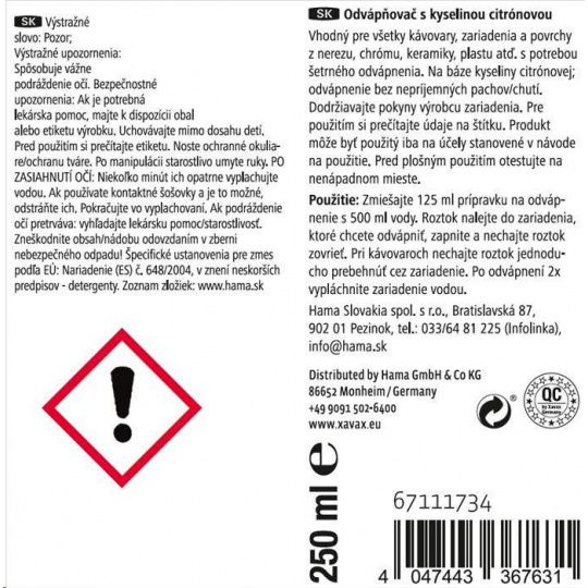- prípravok na rýchle odvápnenie - vhodný pre všetky zariadenia na prípravu čaju, kávy, pressa, kapslové kávovary, aj plne automatické kávovary, varné kanvice, rýchlovarné konvice, ponorné variče, hrnce, nerezové hrnce a panvice, drezy, povrchy z nerezovej ocele, chrómu, keramiky a plastu atď., ktoré vyžadujú šetrné odvápnenie - na báze kyseliny citrónovej: odvápnenie bez nepríjemných pachov/chutí - bezpečnostný uzáver proti náhodnému otvoreniu deťmi - objem: 250 ml - vyrobené v Nemecku Upozornenie: Dodržiavajte pokyny výrobcu zariadenia. Pred použitím si prečítajte údaje na štítku. Pred plošným použitím otestujte na nenápadnom mieste. Použitie: Zmiešajte 125 ml prípravku na odvápnenie s 500 ml vody. Roztok nalejte do zariadenia, ktoré chcete odvápniť, zapnite a nechajte roztok prejsť varením. Pri kávovaroch nechajte roztok jednoducho pretiecť zariadením. Po odvápnení 2x vypláchnite zariadenie vodou.